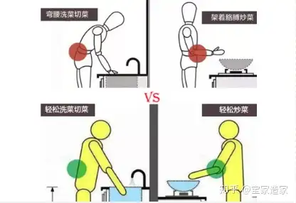 29、考虑做饭洗、切、炒不同高度需求。照顾老人家身高,减少老人弯腰驼背,做饭不累,橱柜一定要采用高低差来解决,标准高台面用于洗菜,降低台面用于切菜、炒菜。
